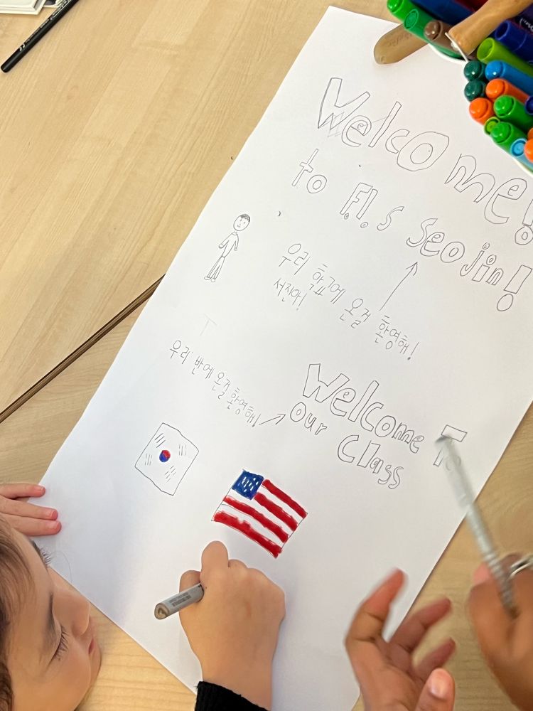 We are working together to make multilingual welcome signs for our new classmate who will be arriving soon from Korea. 🌍🇰🇷🇩🇪 #MultilingualLearners
