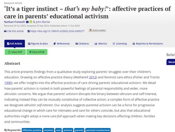 My new article on parental activism, which looks at the caring emotions driving parents' campaign work has now been assigned a volume/issue number @BJSocEd: doi.org/10.1080/014256…