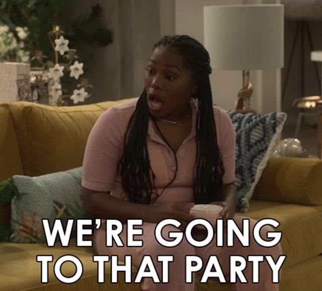 ALT: a woman sitting on a yellow couch with the words we 're going to that party above her