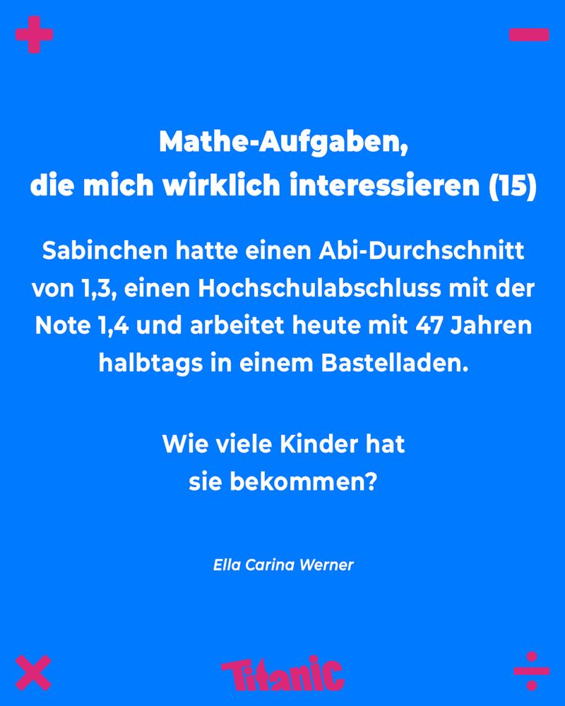 Ella Carina Werner entstaubt die alten Rechenaufgaben. Harte Nüsse für Arithmetik-Afficionados – jetzt jeden Samstag!