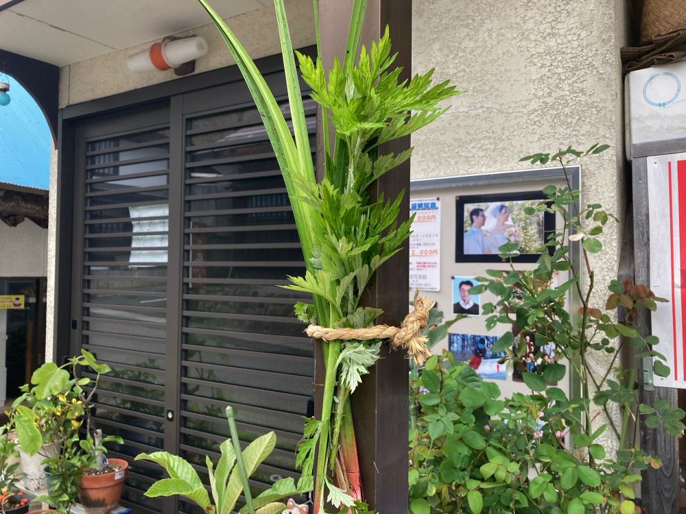昨夜共同風呂に入ったらショウブが浮いていて、明日(今日)旧節句だと気付いた。ほんとは前日に山からショウブとヨモギを採ってきて家に飾るんだけど、今朝採ってきた。ほかの家はもう飾ってある…