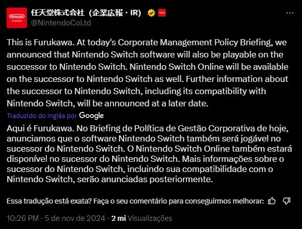 Presidente da empresa fez declaração oficial através das redes sociais da Nintendo