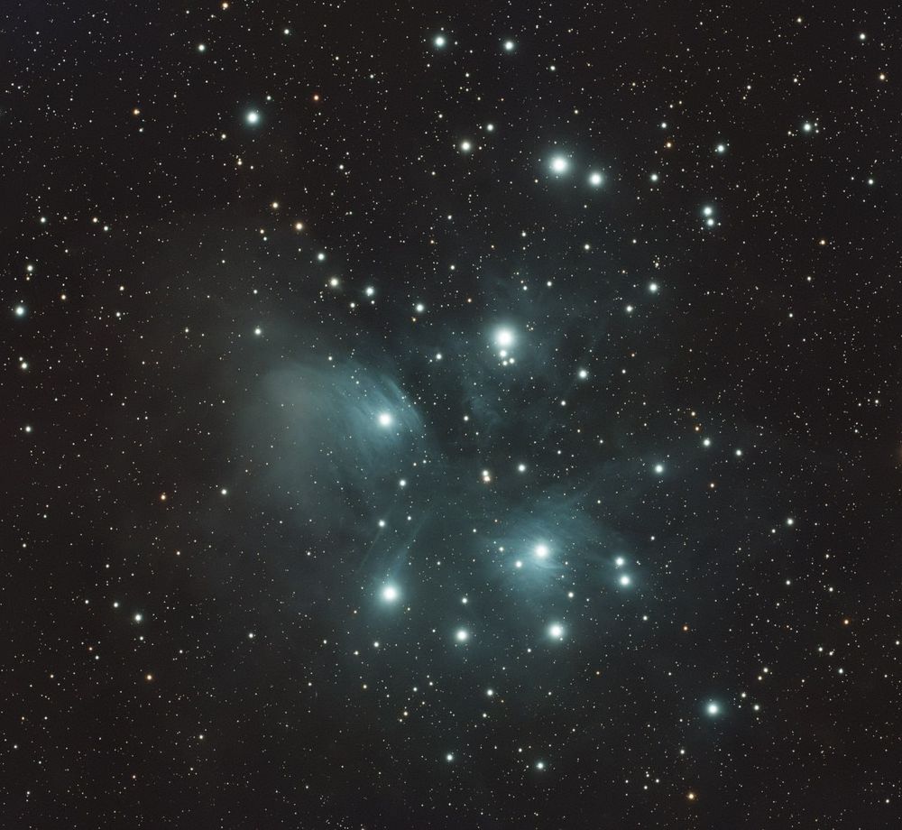 The seven sisters also called the Pleiades. 30m on a 90mm f5.6 refractor. The blue reflection nebula reveals that we are dealing with hot young stars.