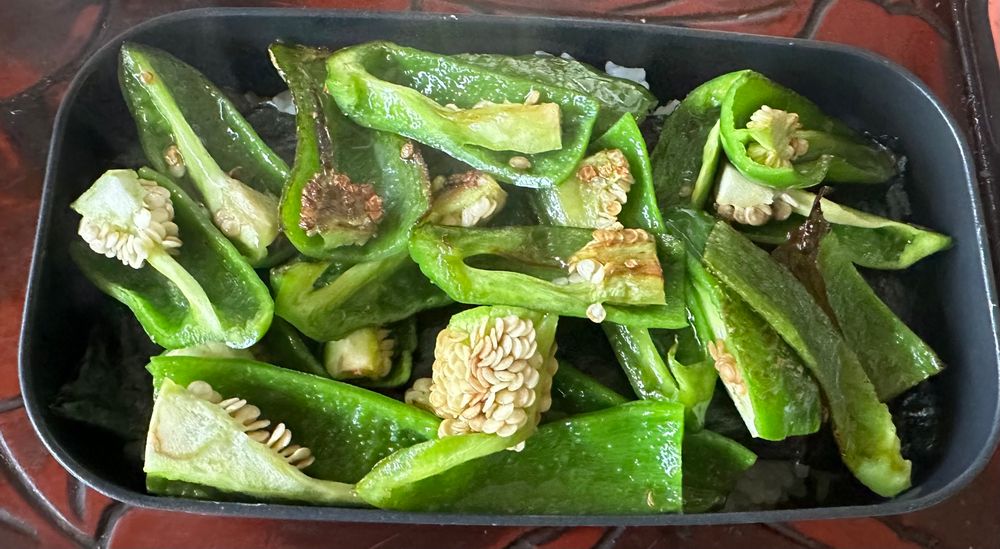 ご飯削節海苔醤油ご飯削節海苔醤油と二段にした上にごま油と塩で炒めたピーマンをのっけるだけ