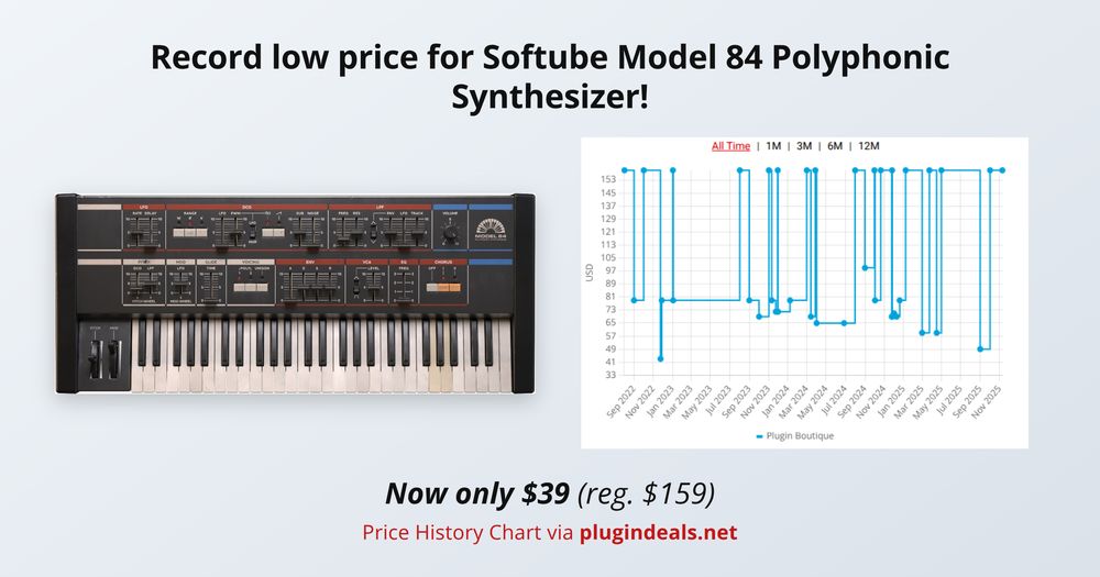 Model 84 Polyphonic Synthesizer by Softube is now 75% off, priced at $39. Offer ends November 16th.