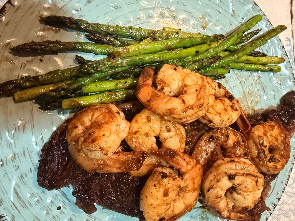 Greek-ish bowl. Prawns, tri-colored orzo, zucchini & tomatoes from our garden, onion, garlic, cremini mushrooms, fresh spinach, my own Greek dried herb blend, sun-dried tomatoes, Kalamata olives, zest/juice of a lemon, finished w/smoked salmon & goat cheese