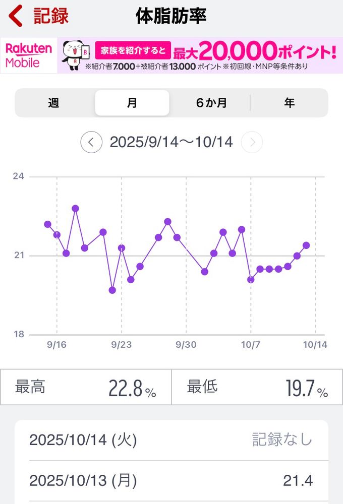 体脂肪率、1ヶ月でやや微減、