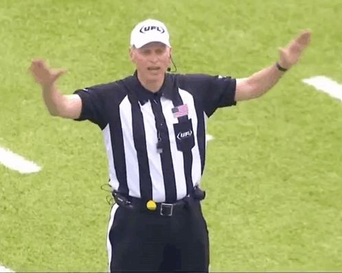 ALT: a referee wearing a striped shirt and a white hat with the word ufl on it