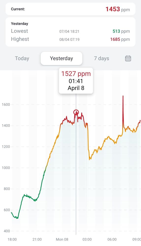 The problem with owning a CO2 monitor is when I can't sleep in a hotel room I look at this graph at 2am and decide that the reasonable thing to do is hold the door of my room open (see drop at 3am) to see if lower CO2 makes it easier to sleep. There's no window to open.