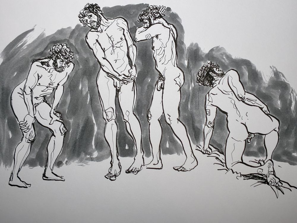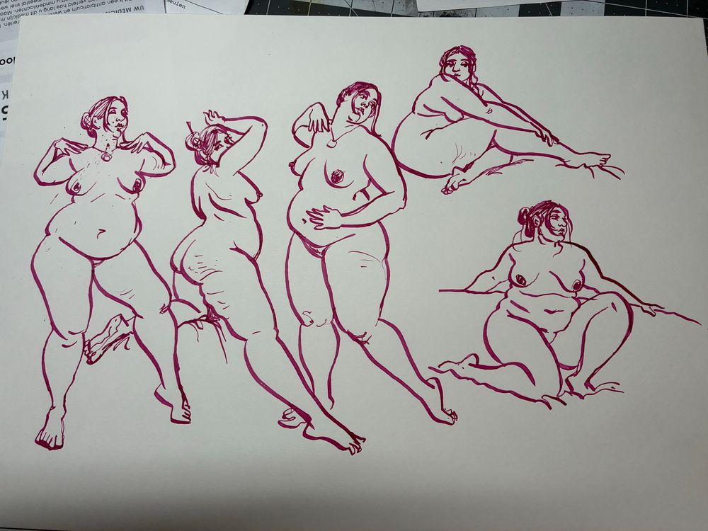 Online life drawing marathon #drawingforgaza models @strakyhutch.bsky.social, Lilian, Sahira, Bianca. #penandink #lifedrawing #modeldrawing
