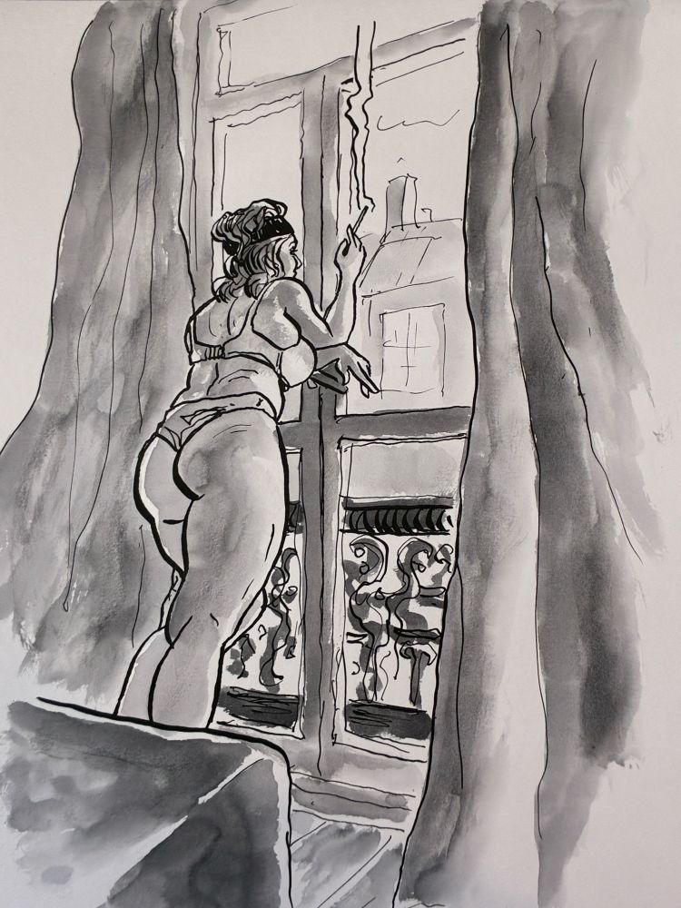 Long pose session with model Donika. I guess this took about 3.5-4 hours. Pen and ink and watercolour.