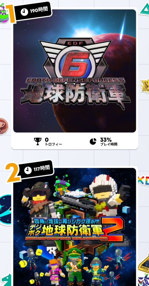 ペンギンが頑張って追い上げてたけど、やはりEDFの壁が高かった様子。5・6のトロフィーがゼロなのは……5はまだしも6のトロコンしたのが1年以上前って事…?嘘だ……そんな時間経ってるんか………?