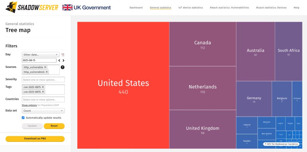Over 28K IPs unpatched (2025-08-07). Top affected: US, Germany, Russia