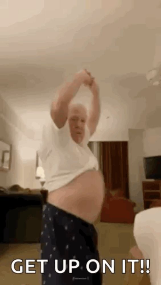 ALT: an older man is dancing in a living room while wearing pajamas and a white shirt .