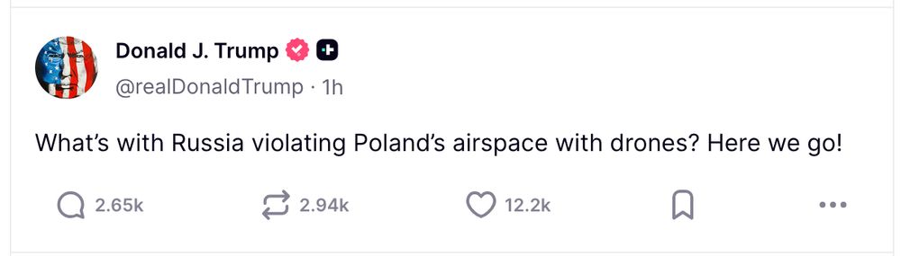 "What's with Russia violating Poland's airspace with drone? Here we go!", is what Trump posted.