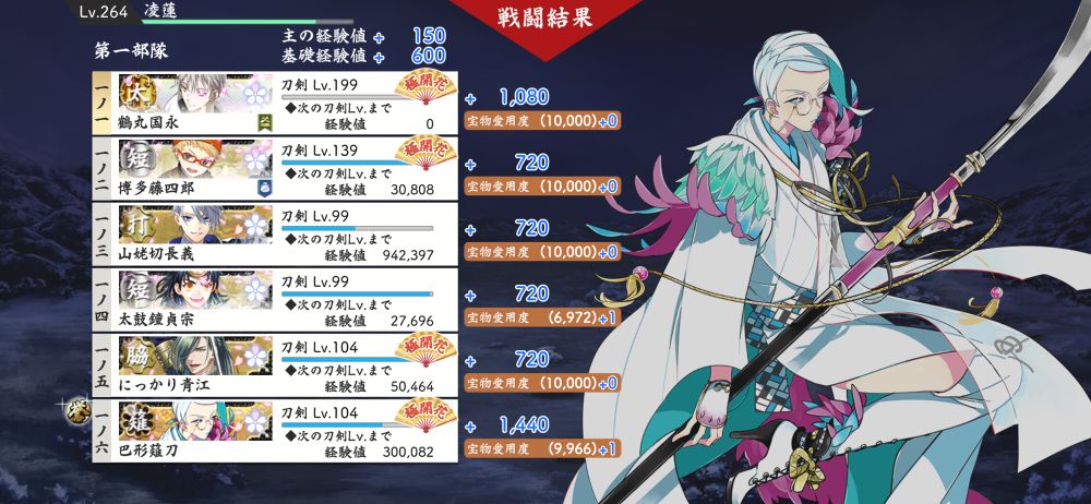 極99だった男士だけで出陣してみたら…ほほぅ、今回は199までしかLv解放されてないんだね? 鶴丸、次のLvまであと0のまま累計だけ重ねてる👀