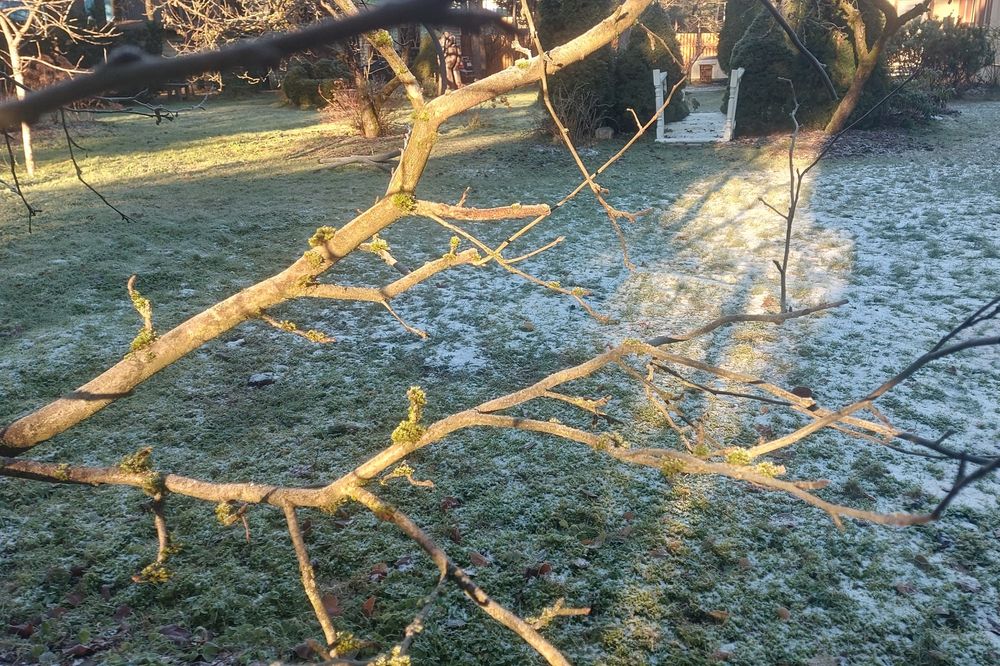 Minus 8 Grad, strahlend blauer Himmel, frostig weißer Boden und die Sonne kommt gerade über den Horizont 🌞. Der Katzenwecker hat sein Näschen nur kurz rausgehalten und sich sofort im Haus verzogen 🐱.
