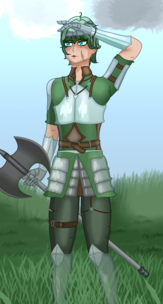 Here's an art of Blom in his full attire. Even though he knows basics of magic, he prefers actual weapons instead of spells.