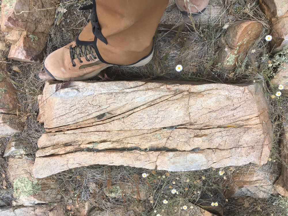 Iron-stained but otherwise colorless/transparent fluorite cubes (I think). I didn’t spend too much time in our collection checking that out, but the shape (cubic) and hardness (4 ish) match fluorite.