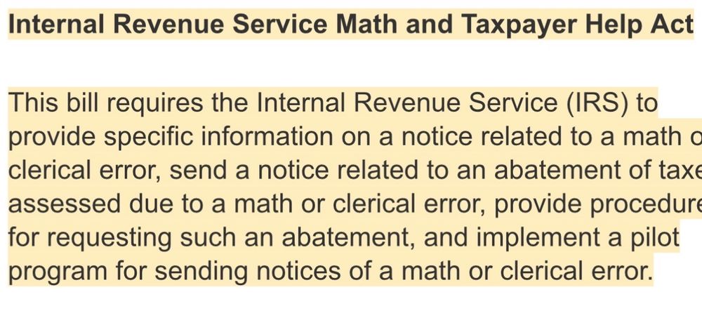 H.R.998 - 119th Congress (2025-2026): Internal Revenue Service Math and Taxpayer Help Act | Congress.gov | Library of Congress https://www.congress.gov/bill/119th-congress/house-bill/998