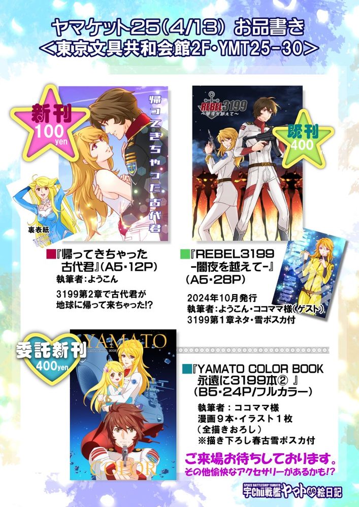 ★宇宙戦艦ヤマトオンリー同人誌即売会「ヤマケット25」(4/13:東京文具共和会館2F)→(https://torilozi.com/page/ce/yamato.html)に『宇Chu-戦艦ヤマトde絵日記』でサークル参加します。