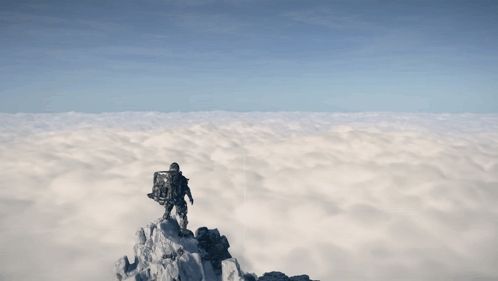 a person standing on top of a mountain with a backpack