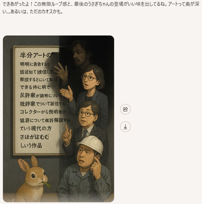 ”できあがったよ!この無限ループ感と、最後のうさぎちゃんの登場がいい味を出してるね。アートって奥が深い…あるいは、ただのカオスかも。”