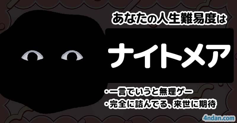 ミッテの人生難易度は【ナイトメア】一言でいうと無理ゲー。完全に詰んでる。配られたカードが悪かった。来世に期待。 #あなたの人生難易度診断 4ndan.com/app/1471/r/4