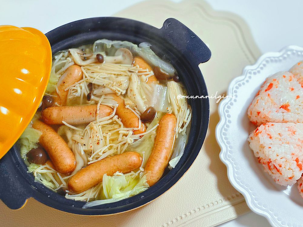 きのことウィンナーのポトフ風、しゃけゴマおにぎり