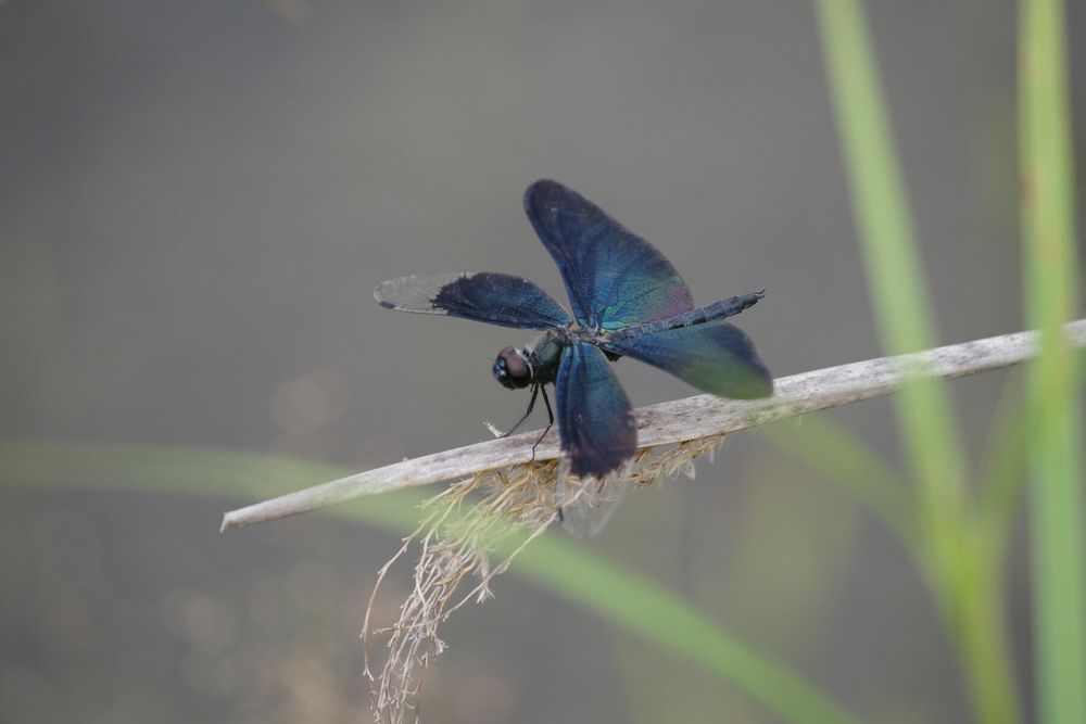 蝶のようにひらひら飛ぶチョウトンボ、ぱっと見は黒い翅が、色素によるものか構造色なのか、角度によっては青紫色の金属光沢を放ってとても美しい。近くでじっとしててくれれば撮れるんだけど…なんせiPhone。