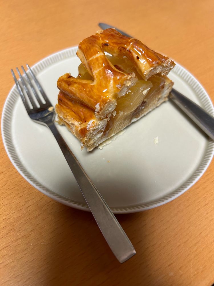 今日のおやつ。ユーハイム ディー・マイスターのアップルパイ🍎遅い時間になったのでカット小さめに。パイはさくっと、りんごはほどよい酸味。土台の生地の上にバウムクーヘンが入ってて美味しい〜 ここのアップルパイが一番好き😊