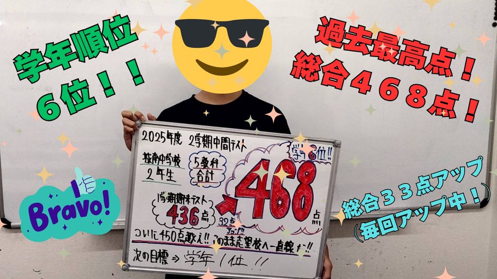 そのかなでも今回は城南中学校2年生の頑張りがピカイチです。【過去最高点更新】【大幅点数アップ】【学年10位以内】と見事な結果です。この勢いで期末テストも大勝利だ!
