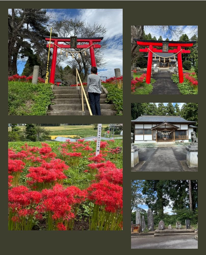 大崎神社を参拝。主祭神は、瀬織津姫命、家津御子命。現在の神社は、貞和5年(1349)創建と伝えられる伏見本屋敷に鎮座の村社三十六所神社に、旧大崎村内の各神社(愛宕神社・宝龍神社・稲荷神社・白山神社)を明治41年に合祀し、さらに翌明治42年には熊野神社社地に三十六所神社の社殿を遷座、同時に熊野神社を合祀して、大正7年に村社大崎神社と改称したものであると宮城県神社庁。ヒガンバナが綺麗に咲いていて、天皇陛下即位記念樹「梓」の柱があった。