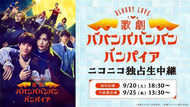 Bloody Love 歌劇『ババンババンバンバンパイア』は、「別冊少年チャンピオン」(秋田書店)で連載されている奥嶋ひろまさのマンガ「ババンババンバンバンパイア」の舞台化作品。 9月20日(土)18:30初日公演と、9月25日(木)13:30千秋楽公演をニコニコ生放送にて独占生中継いたします。 【ライブ配信情報】 【配信日程】 ① 2025年9月20日(土)18:30初日公演 ⇒視聴URL: ②…