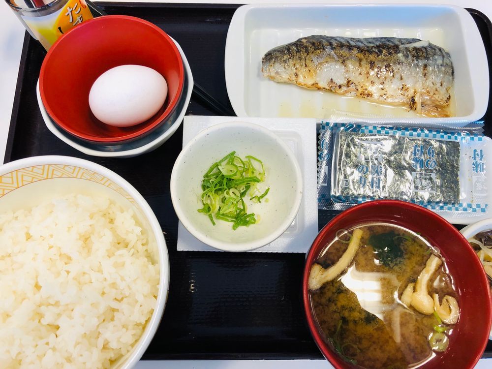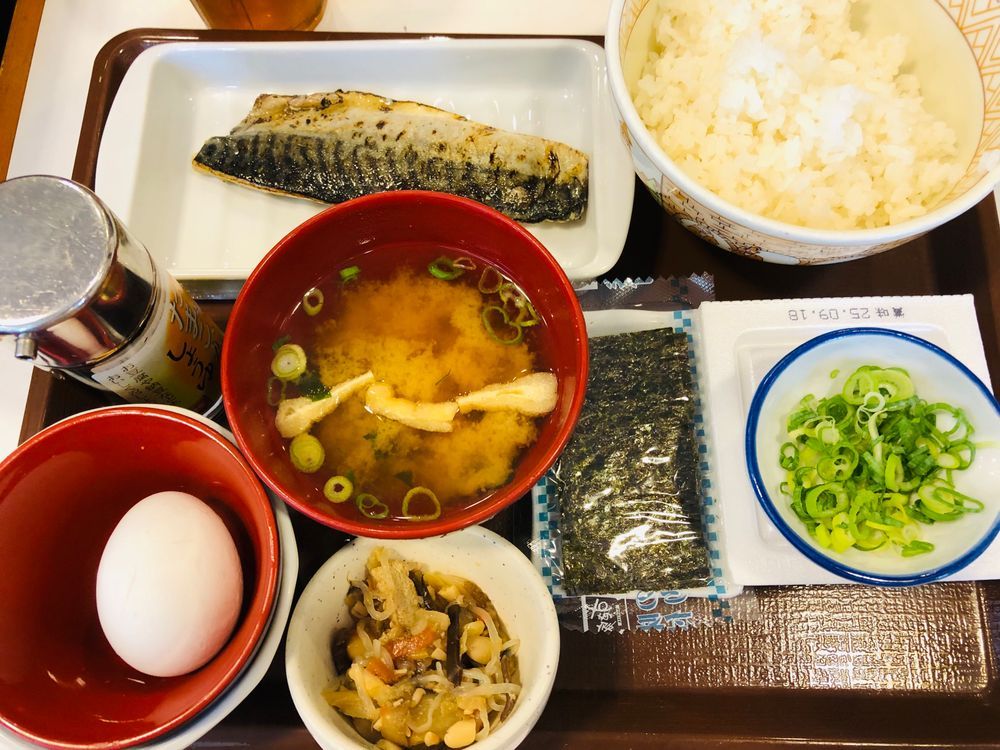 朝ごはんはひさしぶりに #すき家 さんでたまかけ塩さば朝食+納豆を、お昼ごはんは軽めのパンですませました