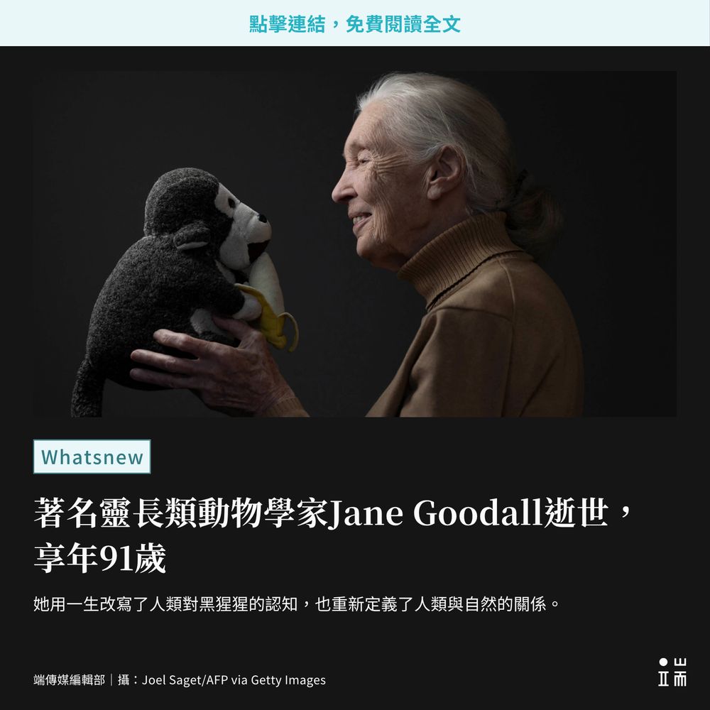 靈長類動物學家、同時也是環保倡議者珍古德(Jane Goodall),因為自然因素在美國加州辭世,享壽91歲。這位來自英國的科學家,年輕時抱著小說《人猿泰山》,夢想走進叢林,最後成為聯合國和平使者,她用一生記錄黑猩猩行為,並呼籲人類正視氣候危機。珍古德的科學突破與環保精神,影響世代深遠。