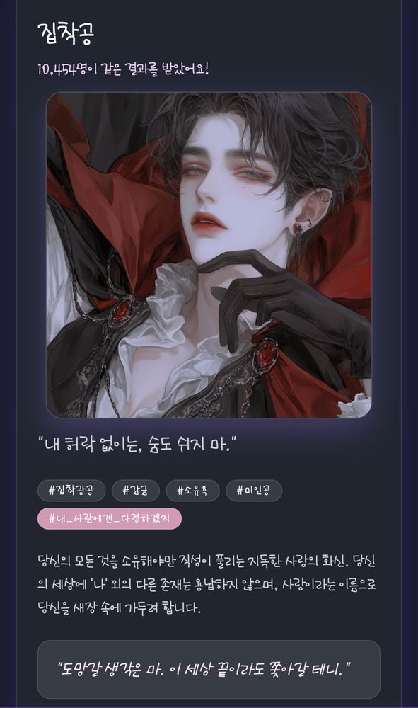 근데 렐 설정이 피폐집착 이런 거 좋아하는 사람들이 좀 험하게 굴려보고 싶어할 만한 부분들이 있음. 18금 후회공 집착공 이 쪽 좋아하는 사람들은 100퍼 굴림수 미인수로 얘 굴림. 물론 나는 그렇게는 안 썼지만. 2차 남성향이라면 ts해서 18금으로 굴릴 듯.