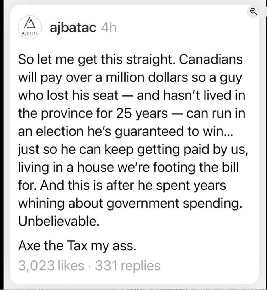PP loses his seat, hasn’t lived in the province for 25 years, yet we’re paying over a million dollars for him to run in a guaranteed win. He still gets a salary and lives in a taxpayer-funded house, all while criticizing government spending.