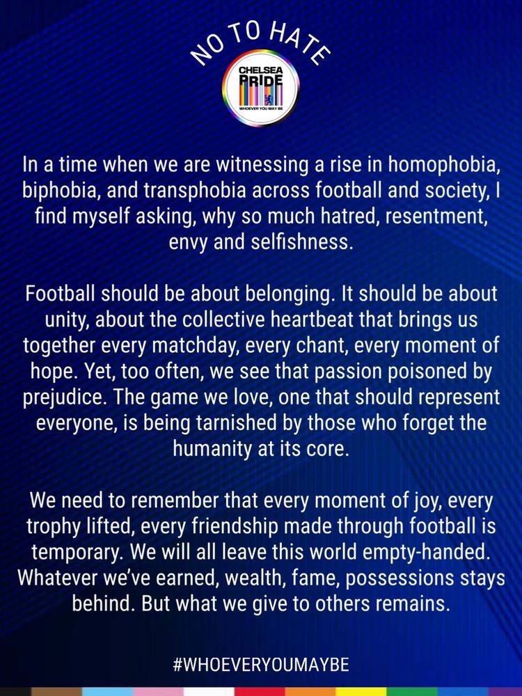 Hate is continuing to rise in football, but love will always be louder. We leave this world with nothing except the kindness, courage & compassion we give. That’s the legacy worth fighting for. 🏳️🌈🏳️⚧️
