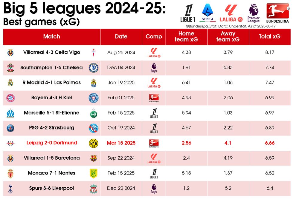 Leipzig 🆚 Dortmund on Saturday was one of the best games of the season in terms of both total xG (6.66) & shots (40).