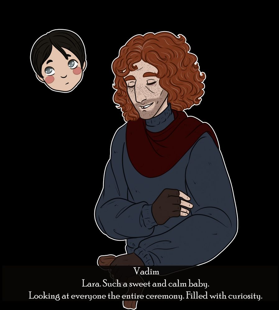 Mentioned in Vadim's backstory he baptized the entire apple basket gang and had to draw it! :D