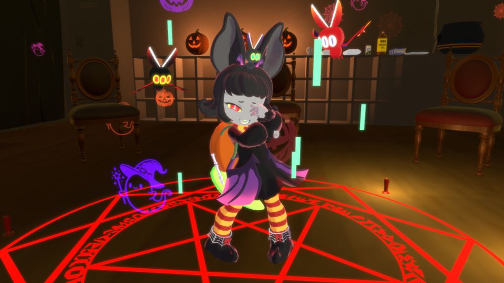 一旦VRCに持ってこれるくらいには形になったのでお写真~!配下にシザーズバットを連れたコウモリ娘ちゃん!!パパの目を盗んで人間界に降りてきた!!みたいなタイプの元気っ子だ!!!
