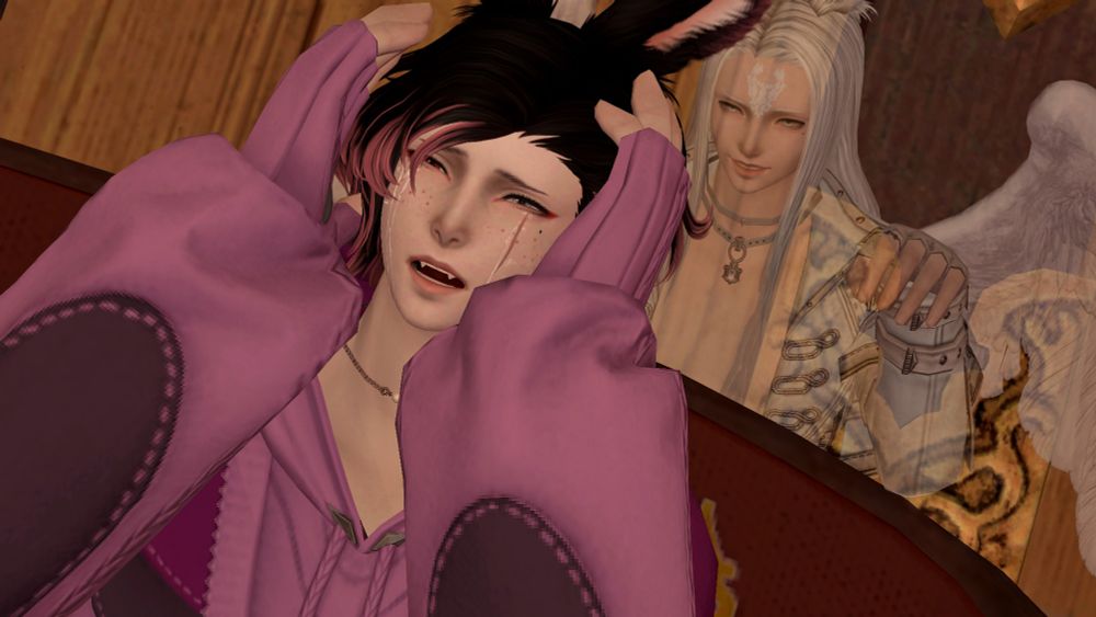 To make up for my previous post and to maybe ease some of the pain, here's some happy Aster with his lovebuns, Raven (@yukioriffxiv.bsky.social) and Caspian (@jaceffxiv.bsky.social).