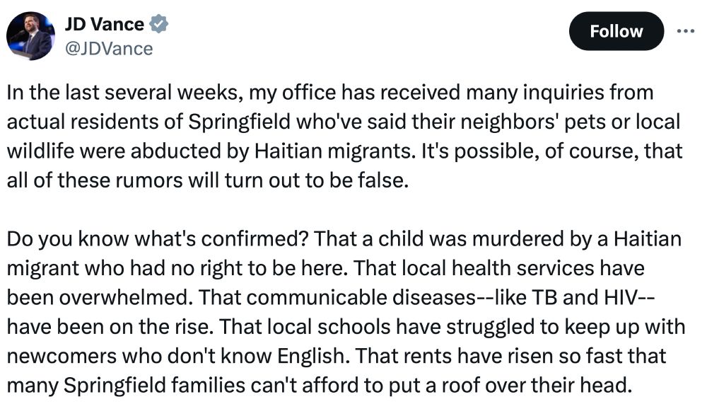 There's no question that, if JD Vance thought it would be be good for him politically, he would start talking about how the Jews of Springfield are abducting Christian children to use their blood in matzah