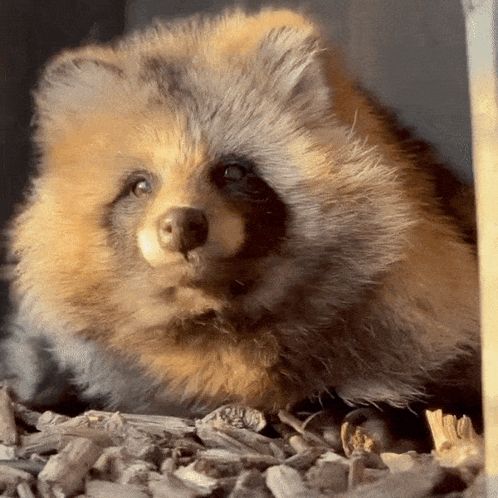 ALT: a close up of a furry animal laying on a pile of wood