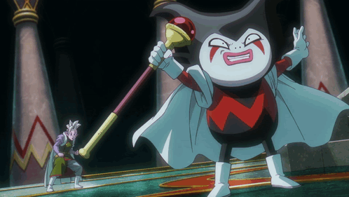 ALT: a cartoon character with a red and white outfit holding a cane