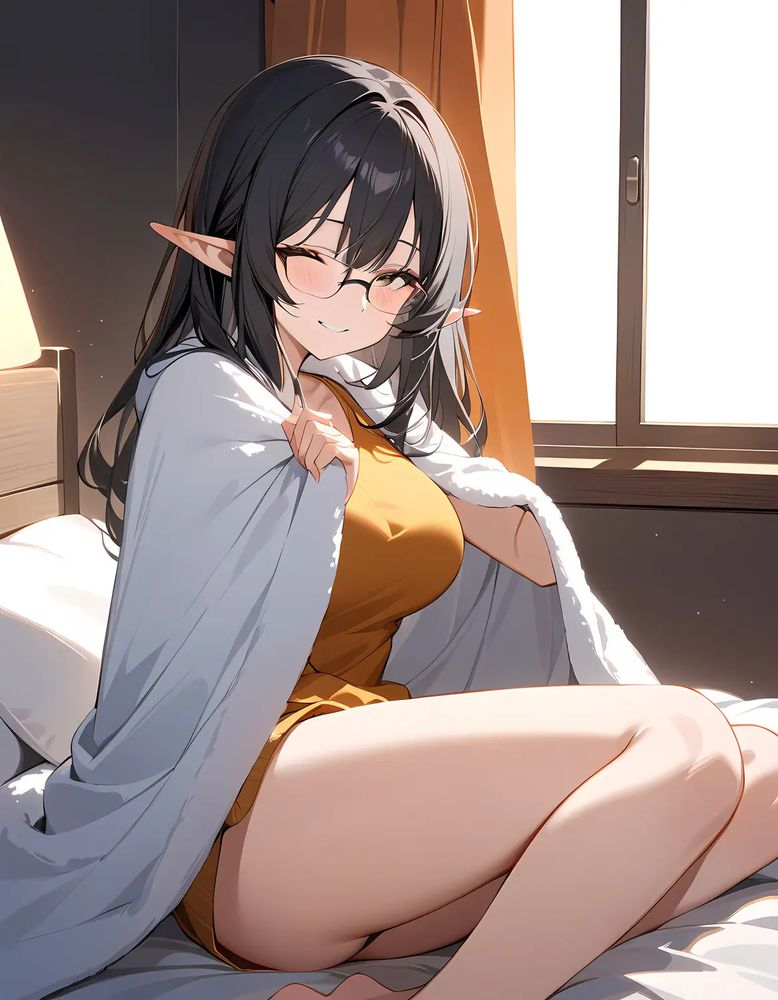 ourt-ai.work/image/1f86e0... #ourtAI #毛布 #下着 #黒髪ロング #眼鏡 #エルフ #黒髪ロング眼鏡エルフ #ourt_AI_Diffusion_XL #t2i #プロンプトあり